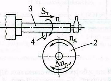 Рисунок 7.3 Схема нарезания зубьев червячных колес: а - червячной фрезой с радиальной подачей Sр; б - червячной фрезой с тангенциальной подачей SТ; в - резцом , закрепленным в оправке ; 2 - заготовка; nф - частота вращения фрезы; nд - частота вращения заготовки в цепи деления; ∆ nд – дополнительная частота вращения заготовки.