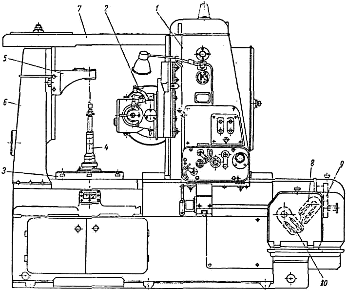 Рисунок 7.4 Общий вид зубофрезерного станка мод. 5Д32: 1,6 - стойки; 2 - фрезерный суппорт, 3 - делительный стол; 4 - оправка; 5 -люнет; 7 - верхняя балка; 8 - гитара подач; 9 - гитара деления; 10 - гитара дифференциала