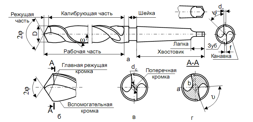 Рабочая часть имеет две винтовые канавки, по которым отводится стружка из образуемого отверстия.