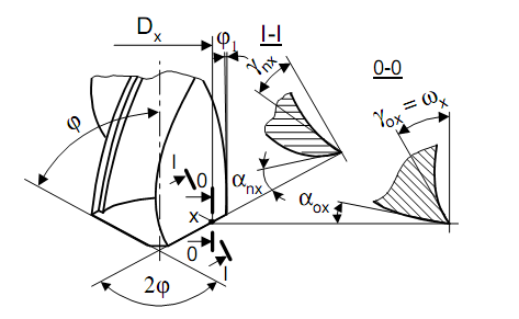 Сверло имеет сложную геометрию передних и задних углов, которые переменны для различных точек режущих кро­мок. В цилиндрическом сече­нии радиусом Rx , передний угол: