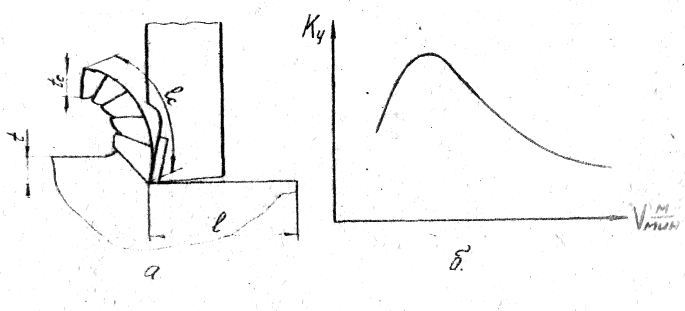 Рисунок 3.7. Схема образования усадки стружки – а); б)-примерный график зависимости коэффициента усадки стружки от скорости резания; ℓс-длина стружки; ℓ-длина пути пройденного резцом; tc-толщина стружки, Ky-коэфициет усадки стружки; V-скорость резания м/мин