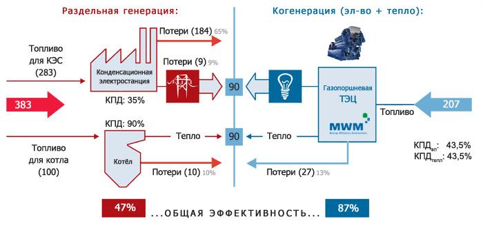 Сравнение энергетических потоков при раздельной и комбинированной выработке энергии (когенерация) выглядит следующим образом (данные приведены в условных единицах топлива):