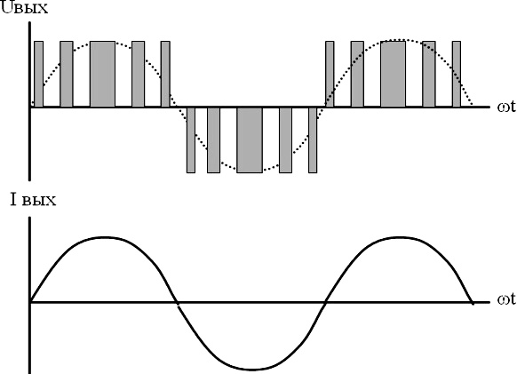 Таким образом, форма кривой выходного напряжения представляет собой высокочастотную двухполярную последовательность прямоугольных импульсов (рис.2). Частота импульсов определяется частотой ШИМ, длительность (ширина) импульсов в течение периода выходной частоты АИН промодулирована по синусоидальному закону. Форма кривой выходного тока (тока в обмотках асинхронного электродвигателя) практически синусоидальна.