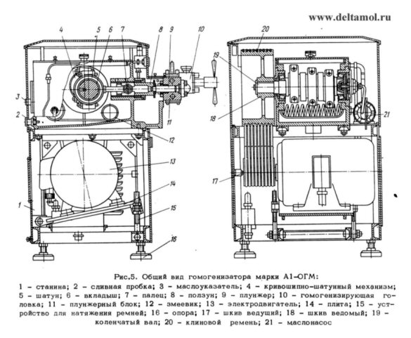 Гомогенизаторы состоят из следующих основных узлов: кривошипно-шатунного механизма с системой смазки и охлаждения, плунжерного блока с гомогенизирующей и манометрической головками и предохранительным клапаном, станины с приводом. Привод гомогенизатора осуществляется от электродвигателя с помощью клиноременной передачи. Кривошипно-шатунный механизм гомогенизатора предназначен для преобразования вращательного движения, передаваемого клиноременной передачей от электродвигателя, в возвратно-поступательное движение плунжеров, которые посредством манжетных уплотнений входят в рабочие камеры плунжерного блока и, совершая всасывающие и нагнетательные ходы, создают в нем необходимое давление гомогенизирующей жидкости.