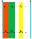 Пусть пространство между обкладками плоского конденсатора заполнено различными диэлектриками (рисунок 7), располагающимися в виде слоев параллельно обкладкам (многослойный конденсатор). С помощью теоремы Остроград- ского–Гаусса для электростатического поля в диэлектрике можно доказать, что емкость такого многослойного конденсатора рассчитывается по формуле