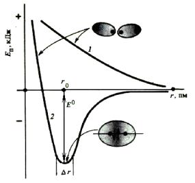 При сближении двух атомов между ними начинают действовать и возрастают по мере сближения как силы притяжения (взаимодействие ядер с электронами), так и силы отталкивания (ядер между собой и электронов сближающихся атомов). На определенном расстоянии эти силы уравновешиваются. Но это еще не означает, что образовалась устойчивая химическая связь. Для ее образования необходимо, чтобы энергия новой системы атомов была меньше, чем суммарная энергия двух свободных атомов. Следовательно, необходимо, чтобы при образовании химической связи выделилась энергия. Чем больше энергии выделилось, тем прочнее связь. При этом происходит увеличение электронной плотности между ядрами, то есть электронные облака сближающихся атомов перекрываются друг другом. Положительно заряженные ядра атомов притягиваются к этой области повышенной электронной плотности. В результате, длина связи –
