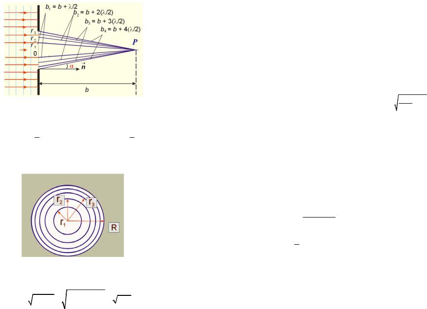 В случае падения плоской волны на экран с отверстием радиус т-ой зоны Френеля rm = mλb , где b — расстояние от препятствия