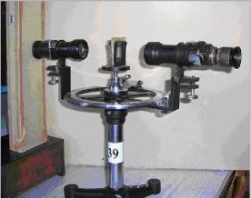 Гониометр состоит из вертикального штатива, на котором в горизонтальной плоскости неподвижно установлена круговая шкала (горизонтальное кольцо), разделенная на 720 равных делений (цена де-
