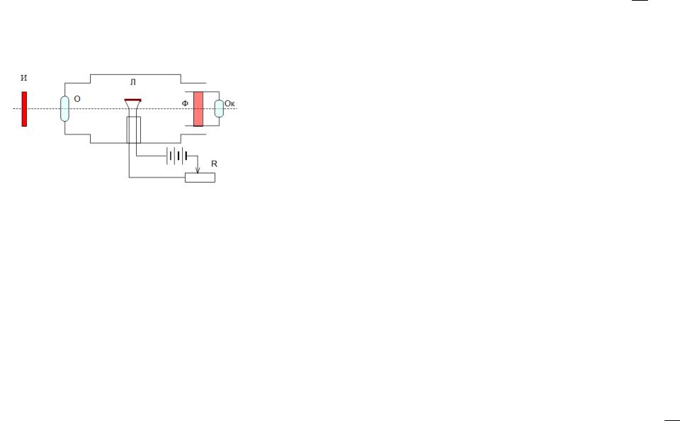 щью которого изменяется сила тока в цепи и, соответственно, накал нити. Нить лампочки и совмещенное с ней (при помощи объектива) изображение поверхности источника излучения (И) наблюдаются в окуляр (Ок). Наблюдение ведется через светофильтр (Ф), пропускающий узкую полосу длин волн в области 660 нм.