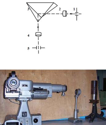Оптическая схема и общий вид монохроматора изображены на рис. 2.14 и 2.15 соответственно. Схема включает в себя коллиматор, состоящий из щели 1 и объектива 2, и зрительную трубу, состоящую из объектива 4 и окуляра 5. Коллиматор и зрительная труба расположены под углом 90º. Объективы можно перемещать вдоль оптической оси для фокусировки коллиматора и зрительной трубы.