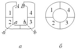 1. Рассмотрим последовательное контактное соединение нескольких металлов: 1, 2, 3, 4 (рис. 3.11а). Найдем разность потенциалов между концами цепи — точками А и В, т. е. внешнюю контактную разность потенциалов. Для этого мысленно разрежем цепь по линии аа. Тогда между свободными концами металлов 1 и 2 была бы внешняя контактная разность потенциалов U12 = ϕ2 – ϕ1. Аналогично между разрезами аа и bb разность потенциалов