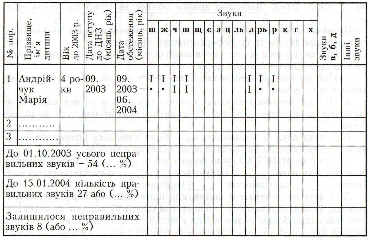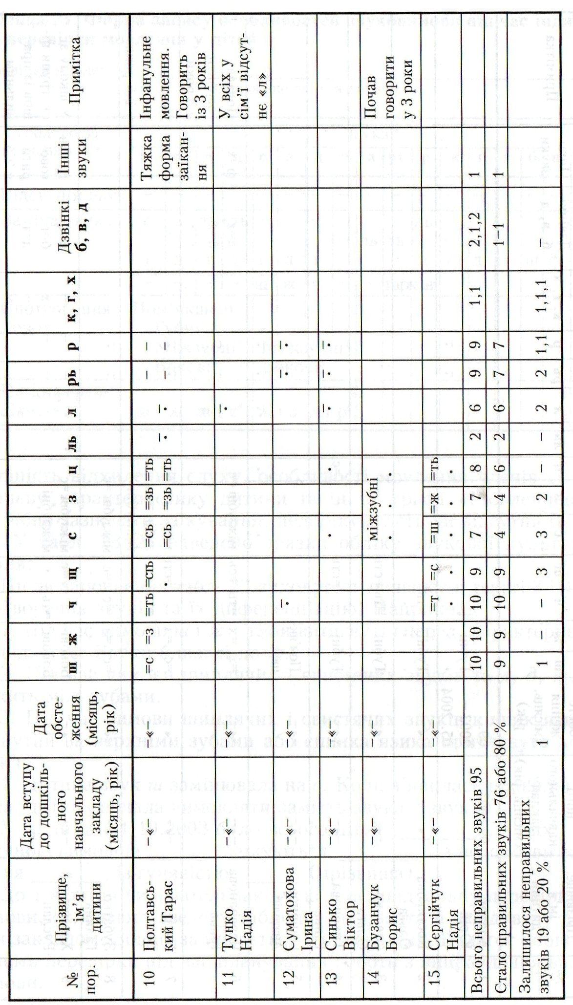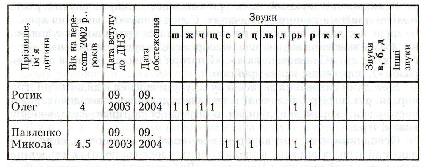 Таблиця 23. Форма запису особливостей звуковимови під час індивідуальної перевірки мовлення у дітей