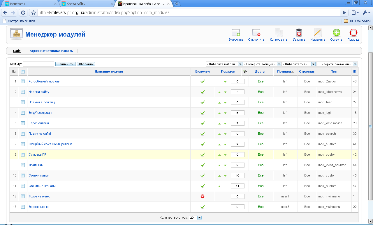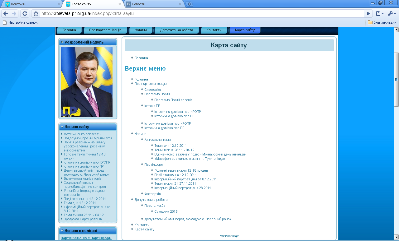 Розроблений мною сайт на технологічній дійсно використовується працівниками Кролевецької районної організації партії регіонів. Матеріал на даному сайті оновлюється майже щодня. Сайт зареєстрований у всіх пошукових системах, що сприяє його продвиганню. Сайт має досить значний функціонал, що задовольнило вимоги замовника.