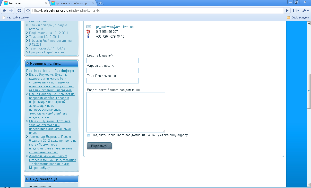 Також за допомогою цього пункту меню «Контакти» можна відправити на електронну почту організації повідомлення, відповідно ввівши своє ім'я, адрес електронної почти та повідомлення.