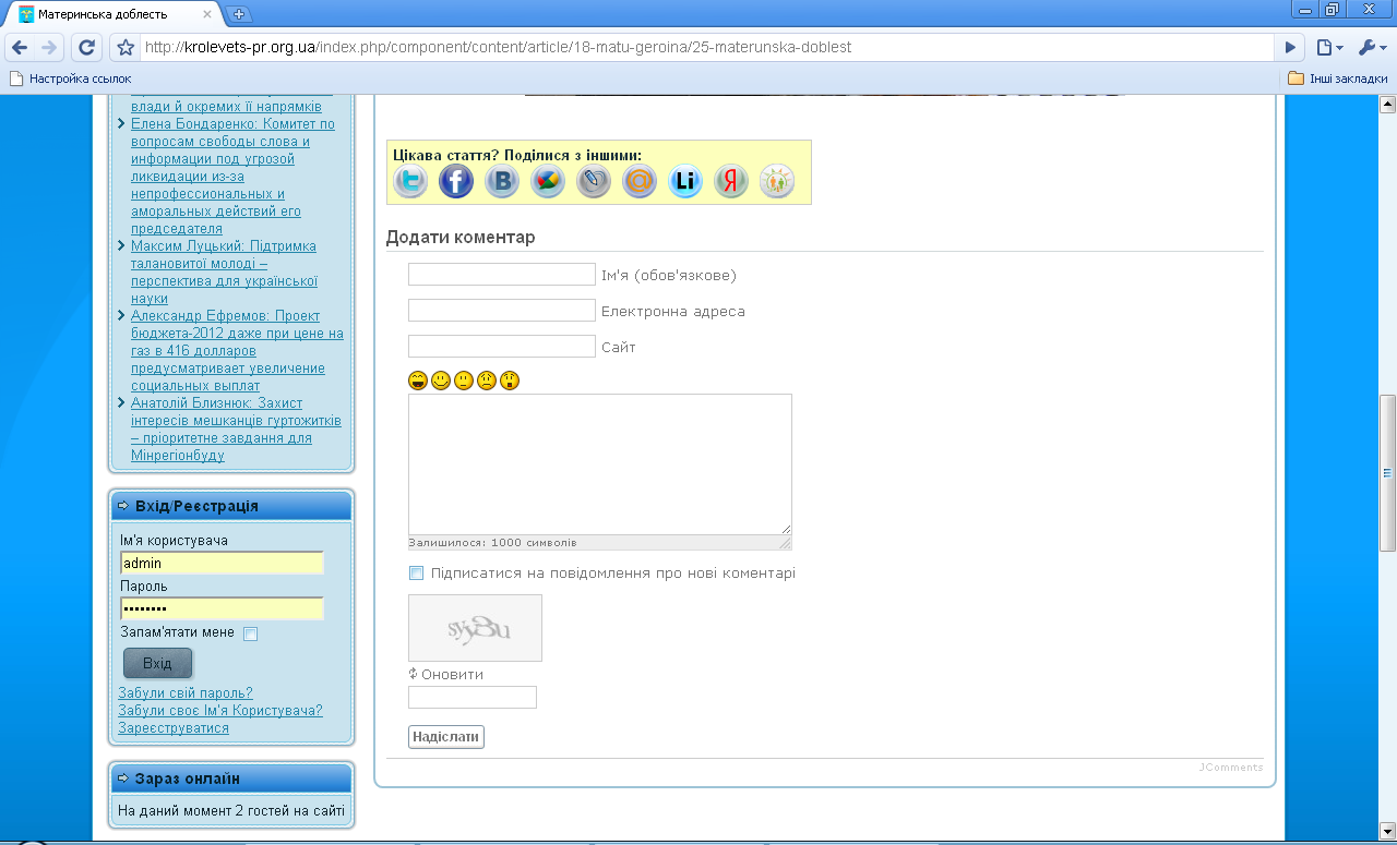 Після натискання на кнопку детальніше нам відкривається повність матеріал, після ознайомлення з ним його можна прокоментувати або поділитися в соціальних мережах, натиснувши на одну з кнопок, які ми бачимо нижче на малюнку 6.3.