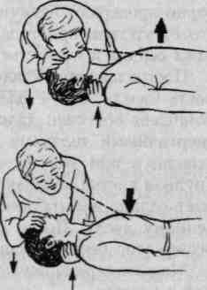 Непрямой массаж сердца. Сущность его заключается в том, что при сдавливании сердца между позвоночником и грудиной кровь выталкивается в крупные артерии большого и малого круга кровообращения. После прекращения давления на грудину сердце вновь заполняется венозной кровью.