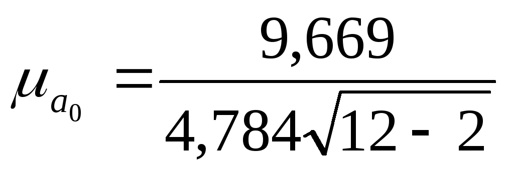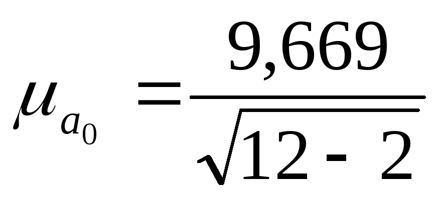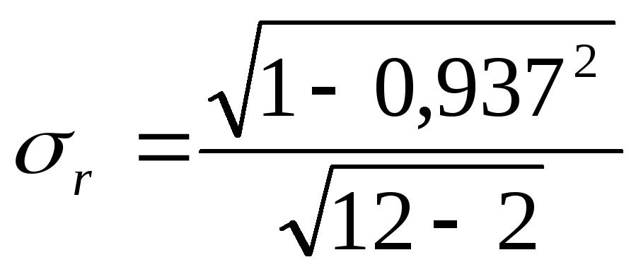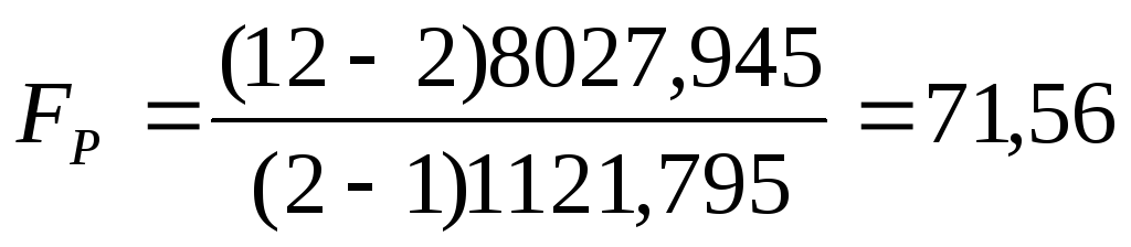 Сравнивая расчетное значение критерия Фишера Fр = 71,56 с табличным Fт = 4,96, определяемое по Приложению 4 при числе степеней свободы ν1 = k – 1 = 2 –1 = 1 и ν2 = n – k = 12 – 2 = 10 (т.е. 1-й столбец и 10-я строка) и стандартном уровне значимости α=0,05, можно сделать вывод, что уравнение регрессии значимо.