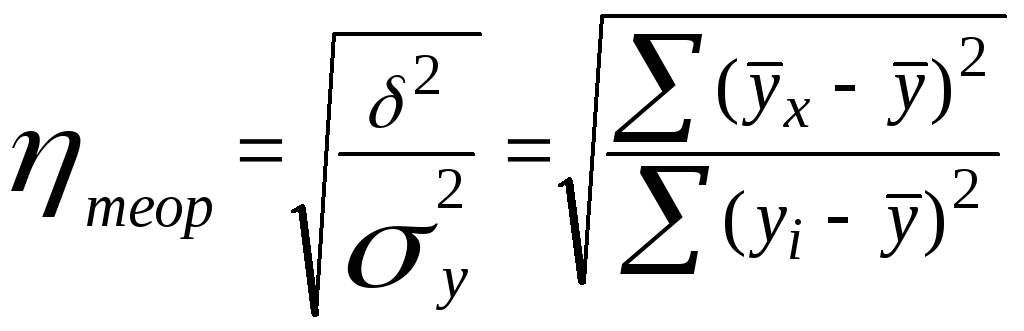который показывает, какую долю в общей дисперсии результативного признака занимает дисперсия, выражающая влияние вариации фактора x на вариацию y. Извлекая корень квадратный из коэффициента детерминации, получаем теоретическое корреляционное отношение