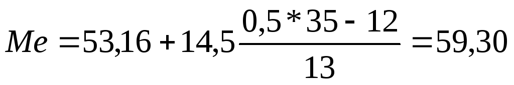 В табл. 12 медианным является среднее из 35 значений, т.е. 18-е от начала значение ВО. Как видно из столбца накопленных частот (6-й столбец), оно находится в третьем интервале. Тогда по формуле (2):