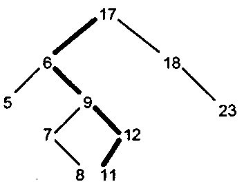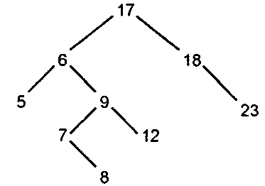 Обычно бинарное дерево строится сразу упорядоченным, т.е. узел левого сына имеет значение меньшее, чем значение родителя, а узел правого сына - большее. Например, если приходят числа 17, 18, 6, 5, 9, 23, 12, 7, 8, то построенное по ним дерево будет выглядеть так (рис. 15.6).