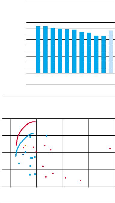 Zusammen mit den hohen Korrelationen führt der geringe Unterschied bei den Branchenrisiken dazu, dass die Spannweite der Effizienzgrenze recht gering ist. Die Differenz zwischen dem Minimum-Risiko- und dem Ma- ximum-Rendite-Portfolio beträgt in Bezug auf die Rendite lediglich 0.4 Prozentpunkte und bezüglich des Risikos 2.1 Prozentpunkte. Beim Länderansatz führt die grosse Streuung der Einzelrisiken hingegen dazu, dass auch die Bandbreite der Effizienzgrenze deutlich grös-