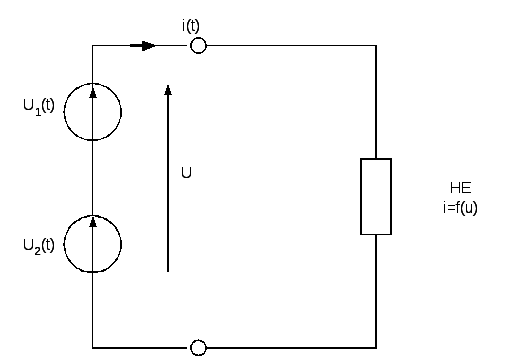 Якщо напруга на вході НЕ (мал.3) дорівнює сумі двох напруг, то струм у ланцюзі буде дорівнює: