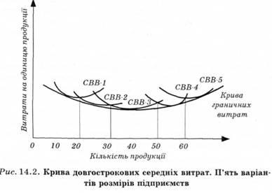 На рис. 14.2 ця закономірність простежується на прикладі п'яти підприємств різних розмірів. Крива СВВ-1 показує динаміку середніх загальних витрат для найменшого із п'яти підприємств, а крива СВВ-5 — для найбільшого. Співвідношення між цими п'ятьма кривими точно відповідає згаданому вище правилу. Будівництво все більших підприємств супроводжуватиметься зниженням мінімальних витрат на одиницю виготовленої продукції аж до досягнення розмірів третього підприємства.