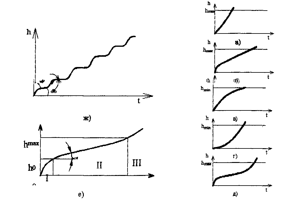 П’ятий закон динаміки спрацювання (рис. 4.3, д) характеризується наявністю трьох стадій спрацювання і бую розглянуто на рис. 4.3,е.