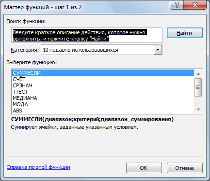 Если вы выделите ячейку и выберите в меню Вставка команду Функция, Excel выведет окно диалога Мастер функций. Немного быстрее можно этого добиться, нажав клавишу со значком функции в строке формул.