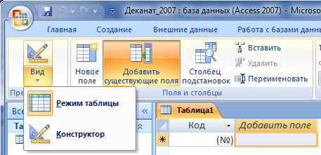 Далее необходимо перейти в режим Конструктор и создать структуру первой таблицы базы данных. Для этого необходимо щелкнуть на пиктограмме Вид и выбрать режим Конструктор.