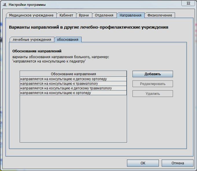 И, наконец, последняя вкладка. Здесь вносятся данные для шаблонного заполнения направлений на физиолечение, ЛФК, массаж.