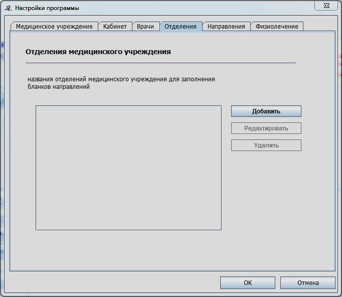 Далее вкладка с отделениями больницы. Также данные необходимы для быстрого оформления бланка направления в одно из отделений.