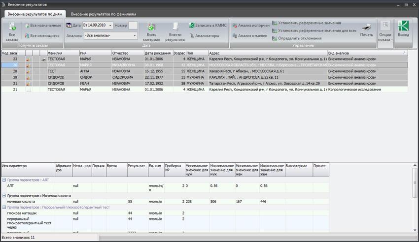 Для внесения результатов автоматизации работы сотрудников самой лаборатории в состав системы включен специальный электронный журнал, который позволяет быстро и наглядно получать доступ к собранным в единые списки назначениям, просматривать журнал выполненных исследований и т.д. Данный модуль позволяет быстро внести результаты измерений вручную или запустить диспетчер драйверов анализаторов. Все результаты, вносимые в ЛИС с разных рабочих мест лаборантов, тут же становятся видны в модуле внесения результатов. Здесь же происходит управление референтными значениями, верификация результатов и их автоматическая отправка в КМИС.