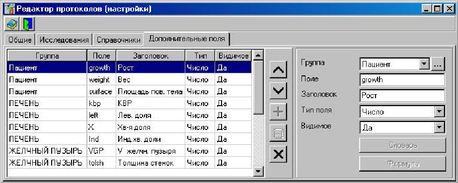 Пользователям программы «Редактор протоколов функциональной диагностики» предоставлена возможность управления списком дополнительных полей, что позволяет учесть в протоколах все специфические параметры каждого исследования. Параметры могут быть разбиты на группы, что обеспечивает максимальное удобство настройки. Программа не требует ручной настройки пользовательского интерфейса в случае изменения списка дополнительных полей, так как соответствующие изменения экранных форм выполняются автоматически. Возможность управления списком дополнительных полей обеспечивает максимальную гибкость программы «Редактор протоколов функциональной диагностики» в условиях быстро меняющихся требований к врачебной практике и медицинским научным исследованиям.