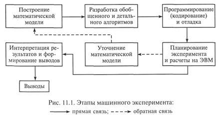 Использование машинного экспериментакак средства решения сложных прикладных проблем, несмотря на присущую каждой конкретной задаче специфику, имеет ряд общих черт (этапов). На рис. 11.1 представлены этапы применения математической (имитационной) модели (по взглядам академика А. А. Самарского).