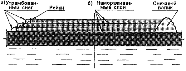 Рис. 4.3.Послойное намораживание ледяного покрова на переправе:а- с ограждением намораживаемых слоев рейками;б- с ограждением намораживаемых слоев снежным валиком.
