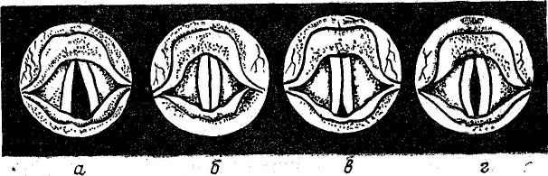 а — открытая голосовая щель при дыхании; б — при звучании голоса; в — при шепоте; г — при фальцете