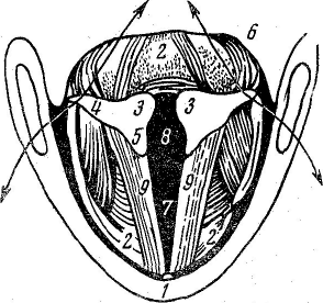 I — щитовидный хрящ; 2 — перстневидный хрящ; 3 — черпаловидные хрящи; 4 — мышечные отростки черпаловидных хрящей; 5 — голосовой отросток черпаловидных хрящей; 6 — перстнечерпаловидная задняя мышца;; 7 и 8 — голосовая щель, 9 — внутренние края голосовых связок. Стрелки указывают направление поворота хрящей 3, от которого меняется просвет голосовой щели.