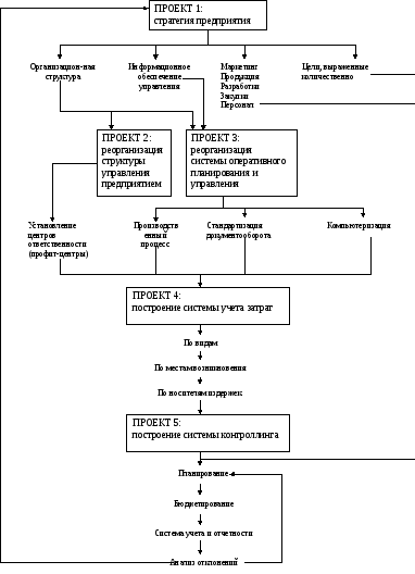Проведенный анализ показал, что разработке и внедрению системы контроллинга должен предшествовать целый ряд взаимосвязанных последовательных проектов по реорганизации системы управления на предприятии (рис. 13).