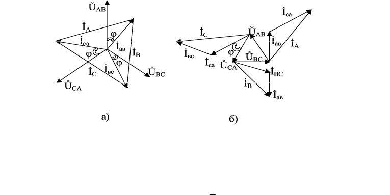 Векторная диаграмма напряжений и токов при соединении фаз нагрузки треугольником представлена на рис. 5.6, б.