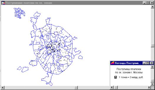 Тип «Плотность точек» используется, чтобы отобразить на карте данные, сопоставленные с некоторой областью или территорией. Общее число точек внутри каждой из областей обозначает значение, которое соответствует этой области. Карта со слоем «Плотность точек», приведенная ниже, показывает сумму поступивших платежей за аренду земельных участков по административным округам г. Москвы . В этом слое объекты, представленные точками, показывают расположение и характеризуют количество поступивших платежей в каждом округе (Рис.7.1.5).Способ также используется для создания карт посевов сельскохозяйственных культур, карт населения, животноводства и др.