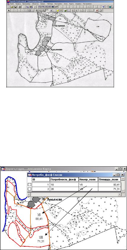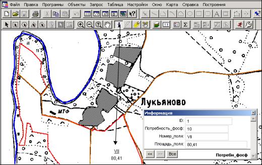 карты (площади участков, длины дорог, координаты углов поворота землепользований и т.п.), а также ответ на ряд нестандартных вопросов, например о количестве полей, содержащих дерново-подзолистые почвы; общей площади трансформируемых угодий и т.д. Для этого используется специальный язык запросов (SQL), который в данном пособии не рассматривается.