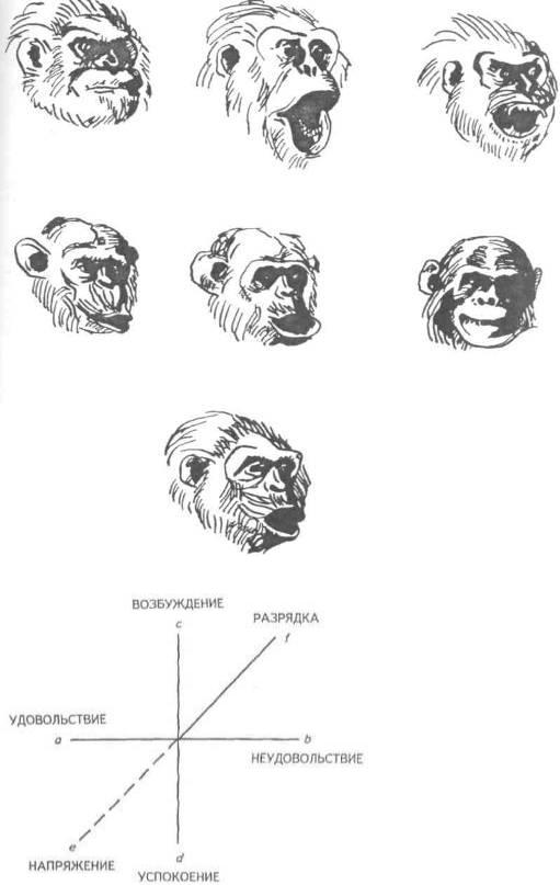 Рис. XII.3. Внешнее выражение различного эмоционального состояния у шимпанзе