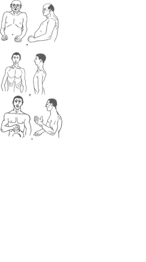 Рис. ХШ.13. Конституционные типы (по >ечмеру): а) циклотимный, в) шиэотимный, с) вкозный ства в характере учителя являют-серьезной помехой в педагогичес-'й деятельности.