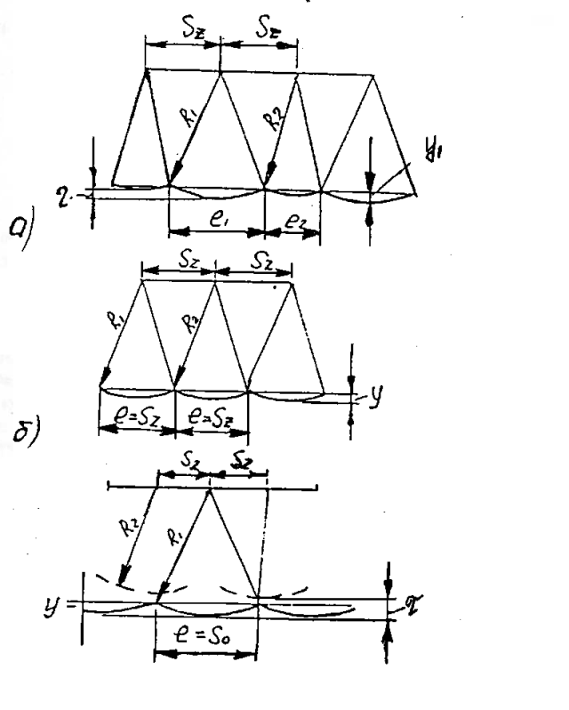 Рисунок 5.1 – Кинематические неровности при фрезеровании: а-образование волн двумя резцами с разными радиусами резания; б-образование волн двумя резцами с одинаковыми радиусами резания; в-образование волн одним резцом с большим радиусом резания