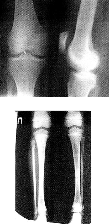 Рис. 6.16 Обзорная рентгенограмма костей голени и коленного сустава. Нижняя треть бедренной кости ребёнка с незаконченным ростом костей.