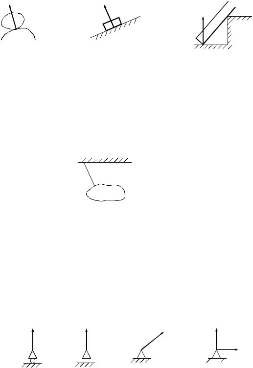 2. Гибкая нерастяжимая невесомая нить. Этот вид связи моделирует ограничения на перемещения тел, которые закреплены канатами, тросами и т. п. Реакция всегда направлена вдоль нити к точке ее закрепления (рис. 4).