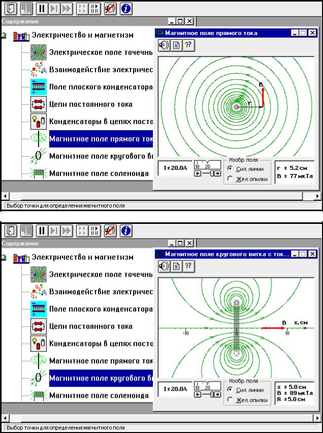 1.Закройте окно эксперимента 1, нажав кнопку в правом верхнем углу внутреннего окна. Запустите, дважды щелкнув мышью, следующий эксперимент «Магнитное поле кругового витка с током». Наблюдайте линии индукции МП кругового витка (контура).