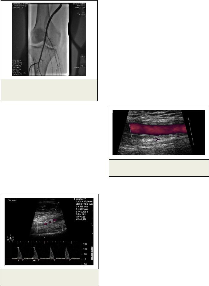 По данным ультразвукового дуплексного сканирования бедренно-подколенный шунт проходим (Рис. 7). В области дистального анастомоза визуализируется стент, в подколенной артерии также визуализируется стент, ультразвуковых признаков стенозов in-stent не выявлено, кровоток в подколенной артерии маги- стрально-измененного типа (Рис. 8). Задняя большеберцовая артерия проходима, кровоток магистрально-измененного типа (Рис. 9, Рис.