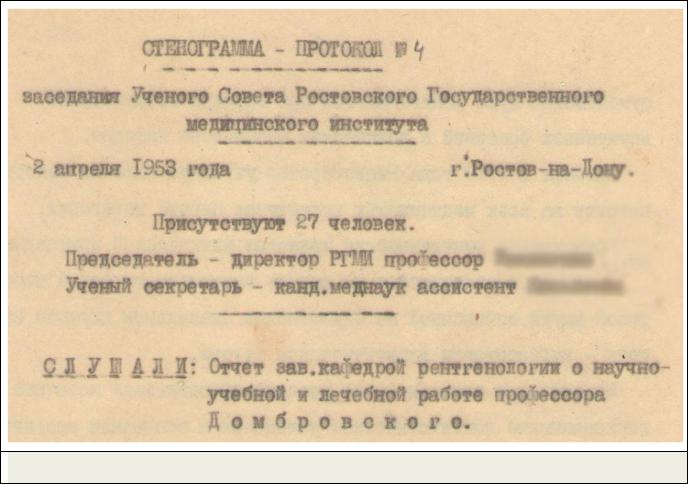 Ключевые слова: заседание Ученого совета, рентгенология, Домбровский А.И., ―Дело врачей‖.